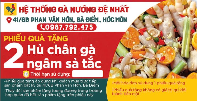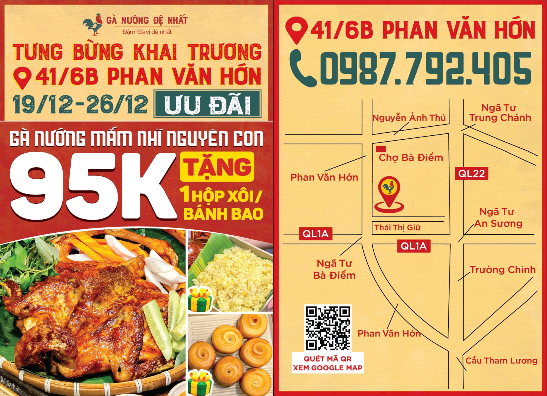 Hãy nhanh tay ghé thăm Đệ Nhất Gà Nướng – Chi nhánh 41/6B Phan Văn Hớn, Bà Điểm để trải nghiệm những món ăn ngon khó cưỡng và nhận ngay các ưu đãi đặc biệt nhân dịp khai trương. Đừng bỏ lỡ cơ hội thưởng thức gà nướng than mắm nhĩ/muối ớt nổi tiếng đầy lôi cuốn với mức giá cực kỳ ưu đãi!