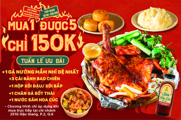 Tuần lễ ưu đãi siêu khủng chỉ có tại 251G Hậu Giang, P.2, Quận 6. Chúng tôi mang đến cho mọi người Combo Gà Nướng Nguyên Con Mua 1 Được 5 chỉ với 150K được áp dụng từ ngày 15/08 - 29/08